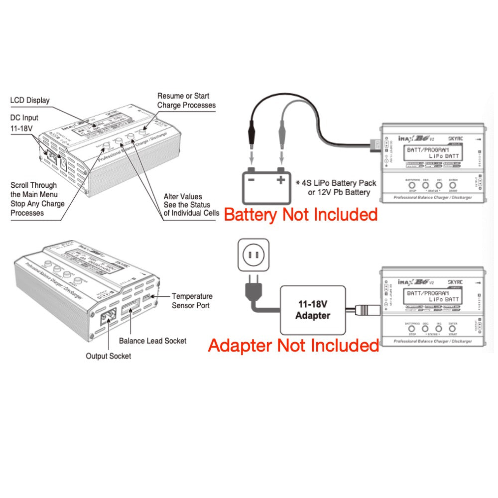 SKYRC B6 is a DC input high-performance, micro-processor controlled charge discharge DC-DC converter with battery management suitable for all mainstream battery types (LiPo LiFe Li-Ion LiHV NiMH NiCd Pb).
